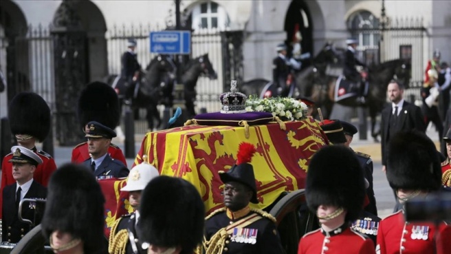 96 yaşında hayatını kaybeden Kraliçe'nin kapalı tabutu, TSİ 14.22'de Buckingham Sarayı'ndan başlayan askeri geçit töreniyle parlamento binasındaki Westminster Hall'a taşındı.