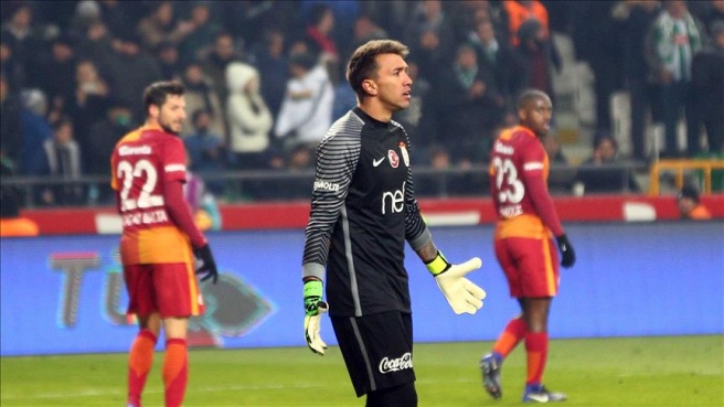 Galatasaraylı kaleci Fernando Muslera, serçe parmağındaki kırık nedeniyle özel eldivenle sahaya çıktı.